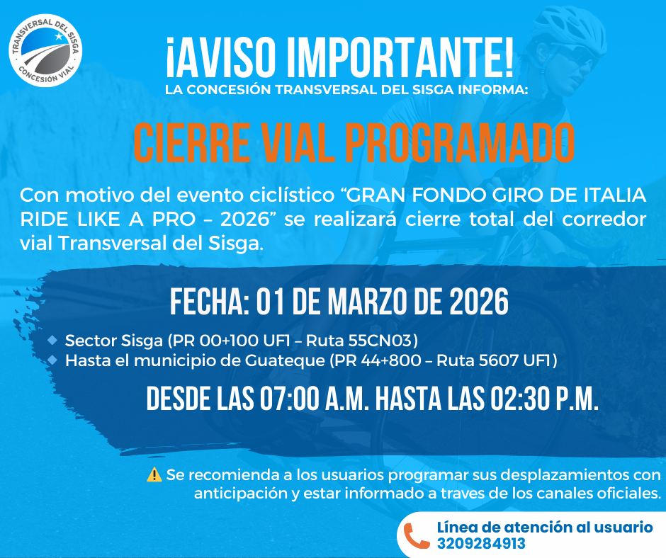 Informamos a nuestros usuarios que, con motivo del evento ciclístico Gran Fondo Giro de Italia Ride Like a Pro – 2026, se realizará cierre total del corredor el próximo 01 de marzo de 2026, en el tramo comprendido entre el sector Sisga y el municipio de Guateque, en el horario de 07:00 a. m. a 02:30 p. m.