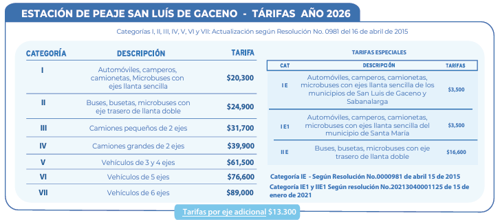 La Concesión Transversal del Sisga, en cumplimiento de los lineamientos establecidos por el Ministerio de Transporte, mediante la Resolución 0000981 del 16 de abril de 2015, Resolución 20233040048765 del 9 de noviembre de 2023, realiza el cobro de las Tarifas de acuerdo con lo ordenado por el Ministerio de Transporte, en la Estación de Peaje San Luis de Gaceno.